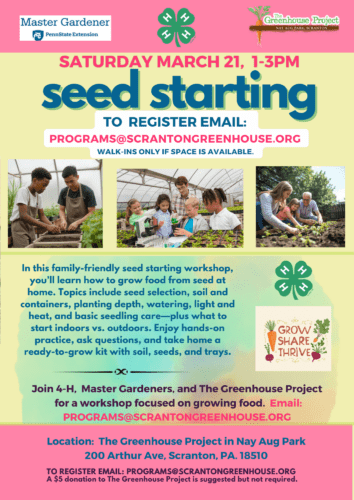 with Penn State Master Gardeners Saturday, March 21, 2026 (1:00 - 3:00 pm) Get Ready for Spring Planting with The Greenhouse Project Join the Greenhouse Project in welcoming the Penn State Master Gardeners who will lead this seed starting class. Includes take-home seed starting soil, seeds, trays, hands-on instruction and demonstration. In this family-friendly seed starting […] |