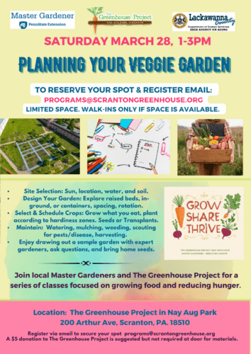 With The Penn State Master Gardeners at The Greenhouse Project Saturday March 28, 2026 (1:00 - 3:00 pm) Join The Greenhouse Project with Penn State Master Gardeners for a hands on learning workshop. Get a head start on 2026 as you learn your best practices for success in the following areas: Site Selection Garden Design […] |