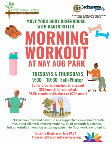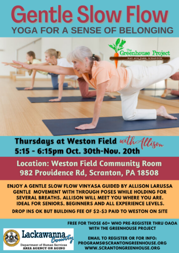 Instructor: Heather Solimini Ongoing: Wednesdays at 5:30 pm (at The Greenhouse Project, Scranton) Join us for SLOW YOGA FLOW outside in the grass of Nay Aug Park with green trees and grass, blue skies and white puffy clouds. Drop-in Vinyasa style 5:15 pm. $10 suggested donation is encouraged. We now have Venmo and Paypal. We […]