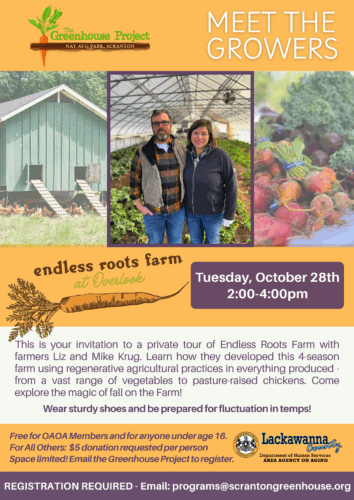 Meet The Growers - Private Tour of Endless Roots Farm, near Waverly, PA Tuesday, October 28, 2025Â (2:00 - 4:00 pm) Join The Greenhouse Project for a private, guided tour of Endless Roots Farm with farmers Liz and Mike Krug (formerly Fuller's Overlook Farm). Learn how they have developed this 4-season farm using regenerative agricultural […]