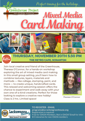 At The Retro Cafe, Capouse Ave, Scranton Instructor: Theresa O'Connor Thursday, November 20, 2025 (5:30 pm) Join local creative and friend of the Greenhouse, Theresa O’Connor, for a hands-on workshop exploring the art of mixed media card making. In this small group setting, you'll learn how to combine textures, layers, materials and methods — like […]