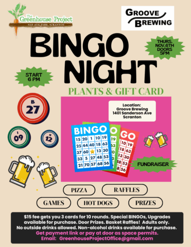** This Event is Full ** Plant & Gift Card BINGO FUNdraiser at Groove Brewing Thursday, November 6, 2025 Doors Open 5:00 pm | Games Begin 6:00 pm Our previous Bingo night SOLD OUT - thanks to everyone who came for the fun and the FUNdraising for The Greenhouse Project! $15 entry fee prepaid gets […]