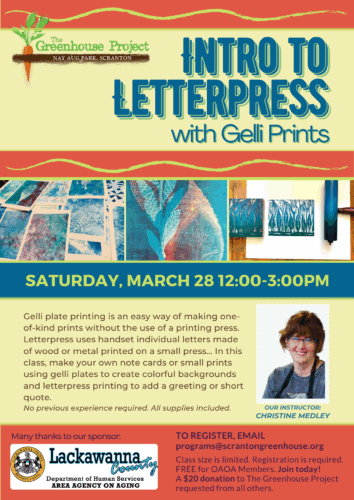 Instructor: Christine Medley Saturday, March 28, 2026 (Noon - 3 pm) Gelli plate printing is an easy way of making one-of-kind prints without the use of a printing press. Letterpress uses handset individual letters made of wood or metal printed on a small press... In this class, make your own note cards or small prints […]