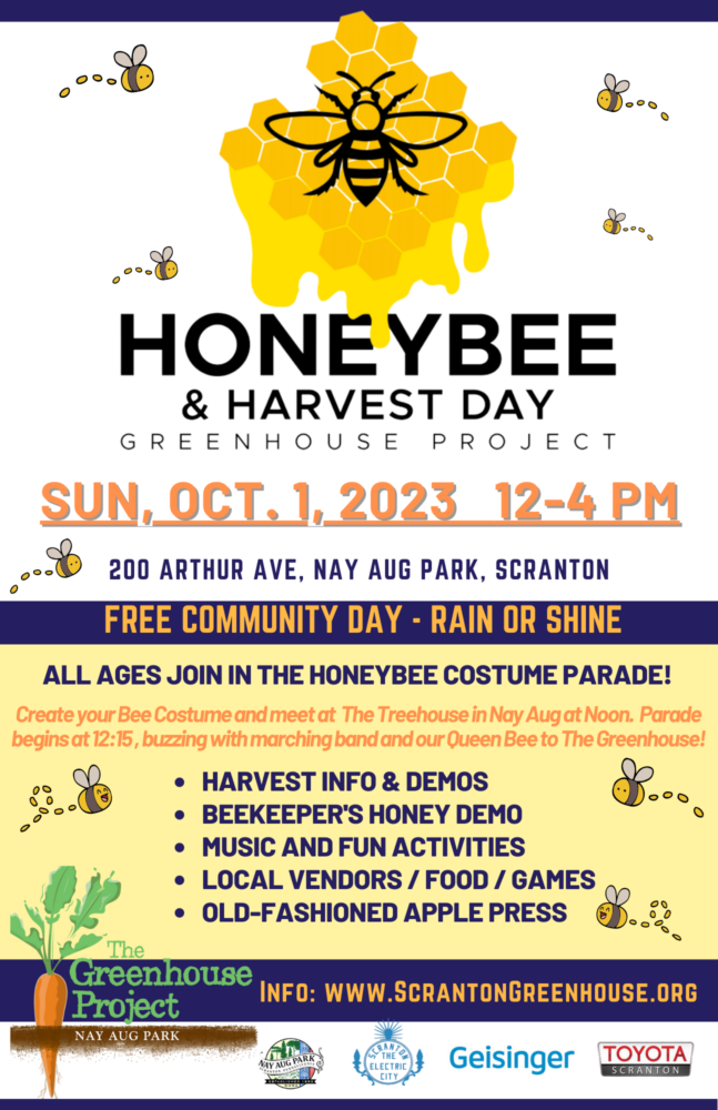 The day kicks off with a Honeybee Costume Parade featuring YOU in costume marching & buzzing behind our Queen Bee! Harvest Demonstrations, Vendors, Food, Games & Activities for Families, Music by DJ Jason Miller, Raffle Baskets… and more. Tell your friends and we’ll see you on October 5th!
