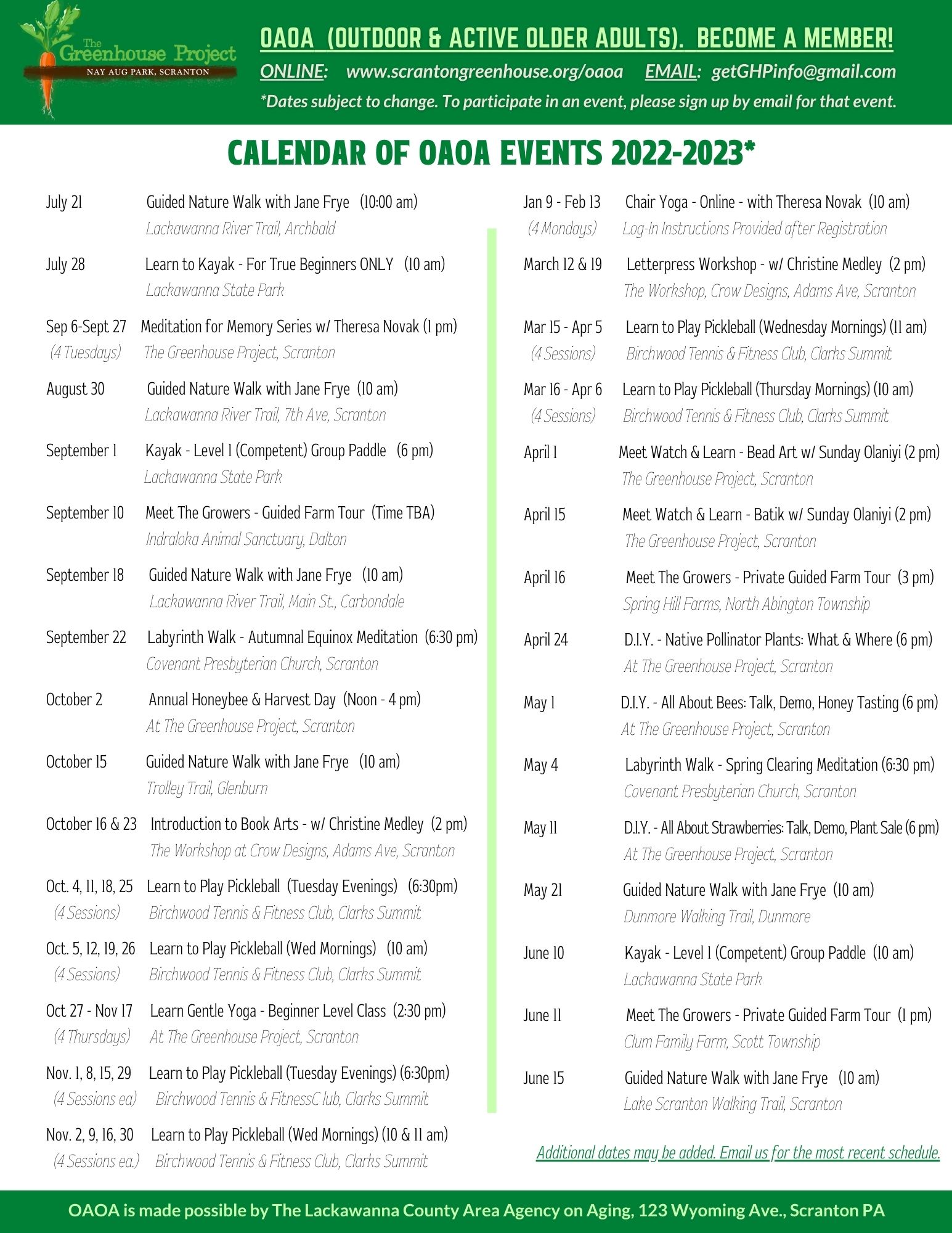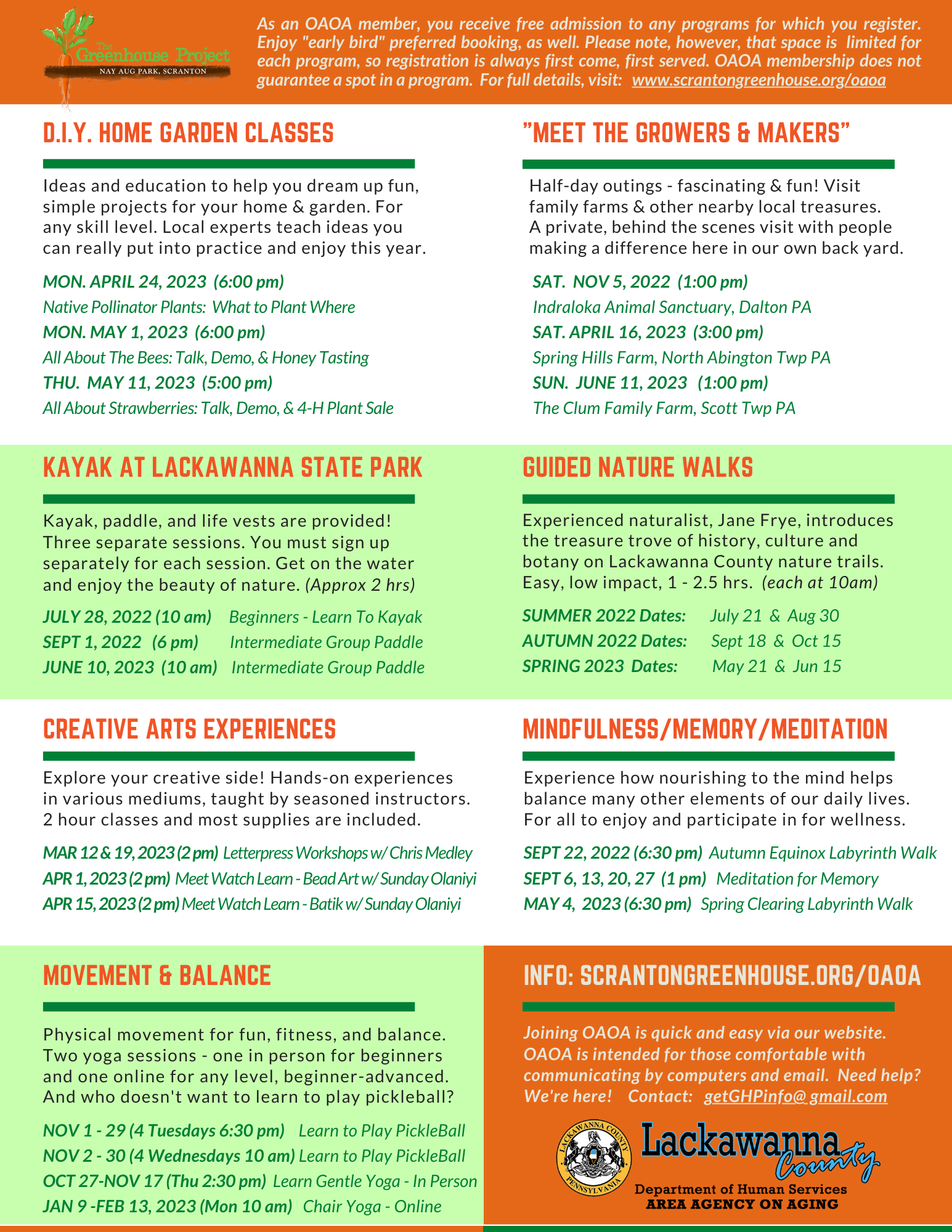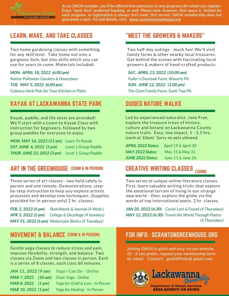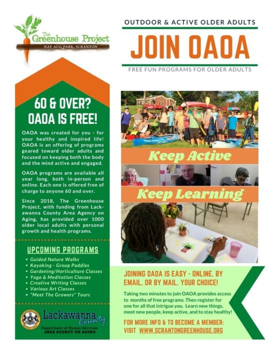 OAOA is an offering of programs for older adults (60+) focused on keeping both the body and the mind active and engaged. OAOA programs are available all year long, both in-person and online – offered free of charge to Lackawanna County PA residents age 60 and over. (Not a Lackawanna County resident? Programs are still open to you at low cost.) Once you are registered for OAOA – review the schedule of programs and request to sign up for one program or enjoy them all!